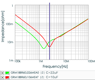 22uF的去耦电容在该频率时的AC等效阻抗如图约为0.01 ohm,10uF的甚至只有0.005 ohm!这意味着,高频通路中,这个小小的电容提供的能量,远比这条铜制导线来的给力,就近放置的小蓄水池,远比远处的大池子管用!
