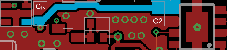 这就是发生血案的那个简单电路,右侧5V输出,通过蓝色一段1.3cm的导线导线进入左侧的DC-DC芯片转换到3.3V,文档提到“尽量靠近输入引脚放置10uF的Cin去耦电容”,然而右边的5V输出芯片也需要就近放置一个10uF的电容,因为自作聪明觉得“不至于这么近都得放两个”,就给合并了。出问题的版本只保留了右侧C2,去掉了左侧的Cin