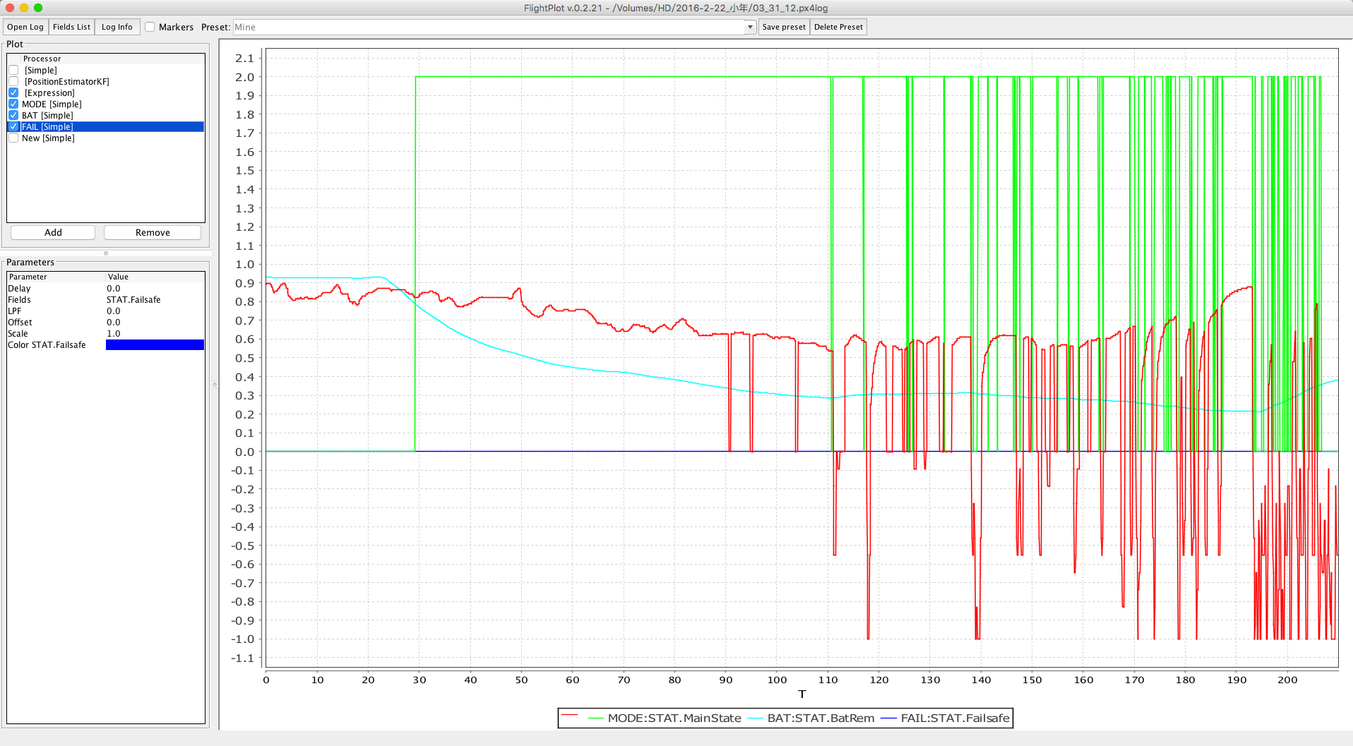 一次飞行,后半段频繁失控的记录数据(红色是RSSI,飞远后逐渐下降,出问题时则频繁短暂归零;绿色是飞控模式,出问题后频繁从定点模式“2”切换到简单模式“0”)