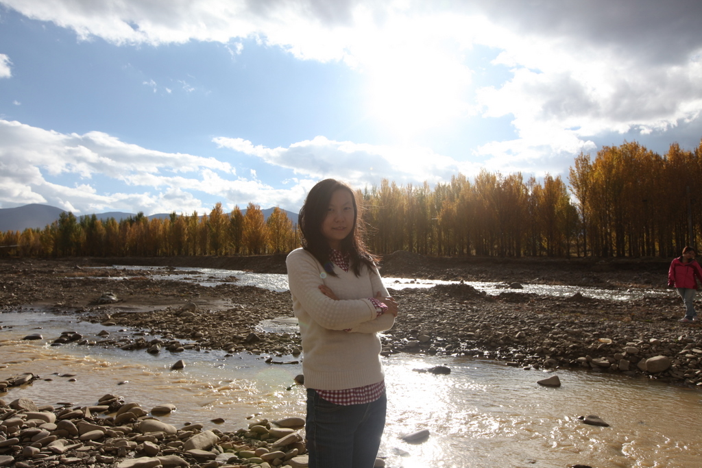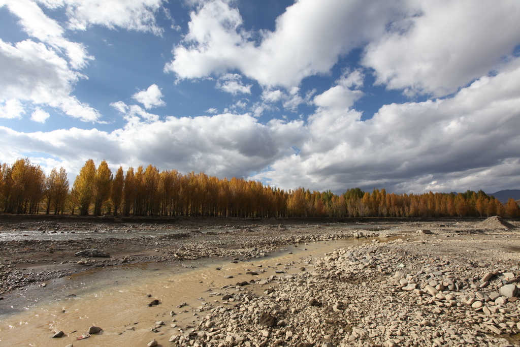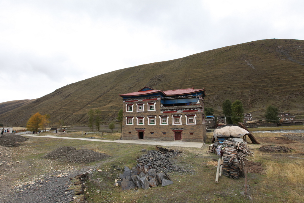 一片黄色的青杨林镶嵌在清澈的河水中突然出现,停车休息下来看看,一幢藏式的民居在河边,建的很是漂亮,一个8~9岁的藏家小朋友在卖酸奶,买一杯全当是支持他了,没想到这成了这一路最好吃的酸奶,浓浓的奶味是其他任何罐装的酸奶都绝不能比,奶皮搅碎混入,香碎弥漫其中,下次再过,我得买上一筒!后面看地图这里好像是“格巴宗”