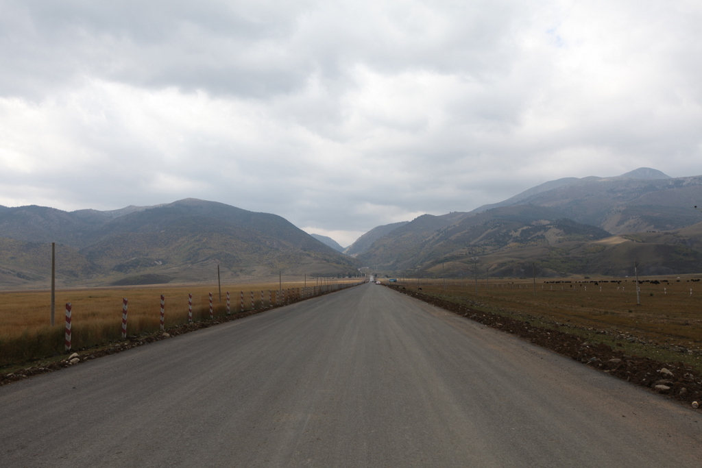 就在一座顶部有块大石头的远山渐渐靠近时,我们走完了平原,又开始爬山了,好路逐渐减少,伴随着修路工人和压路机的临近,开始了只修好一侧的单边放行道路,然后,柏油路彻底没了,车在泥土和小石子路上飞驰,好在路是压过的,比较平坦。然后尘土开始出现,然后尘土压过了一切……一路紧闭车窗,有些绝望的看着一直通向天边的烟尘,旁边是真有两只耳朵的兔儿山,这一路看来都是这样了。