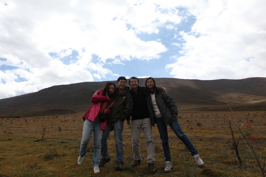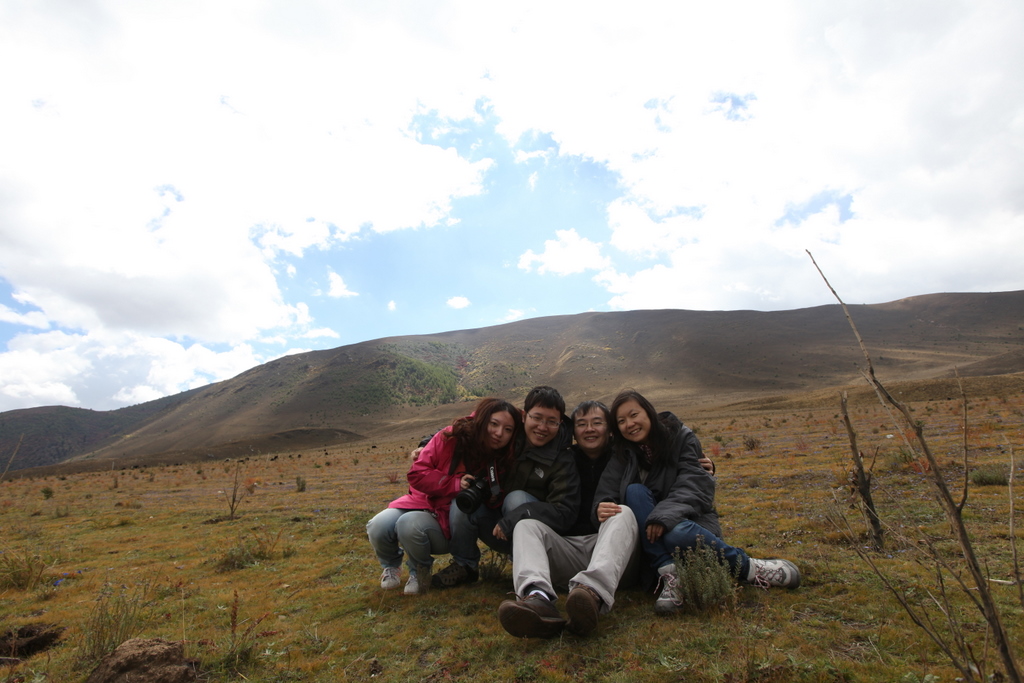中午时分,到达桑堆,路逐渐恢复正常,一片宽阔的牧草地铺向不远的山丘,草地上野花点点,真想在这里铺上防潮垫躺着看会儿书!拍了几张小花,请刚好在此的另一车广东兄弟帮我们拍了合影,得到几张角度非常不错合影。