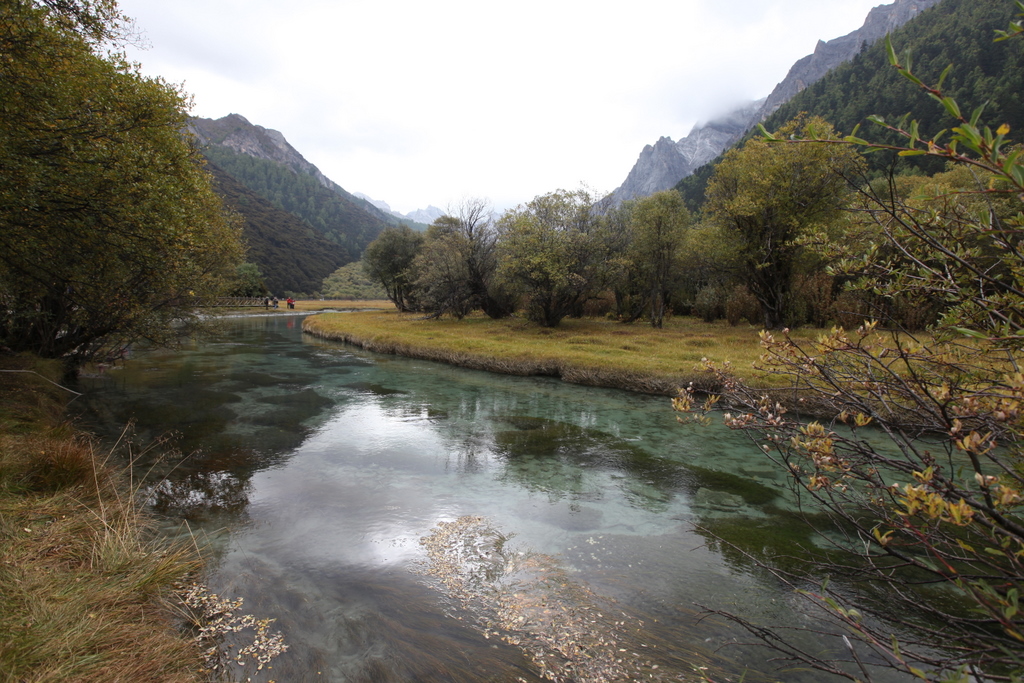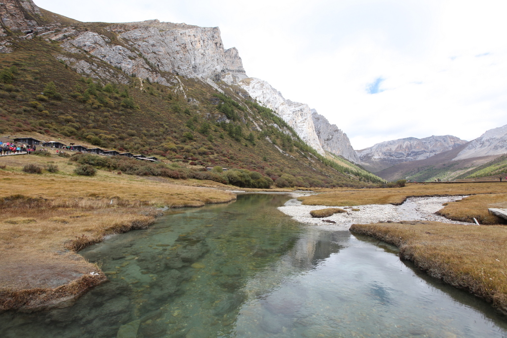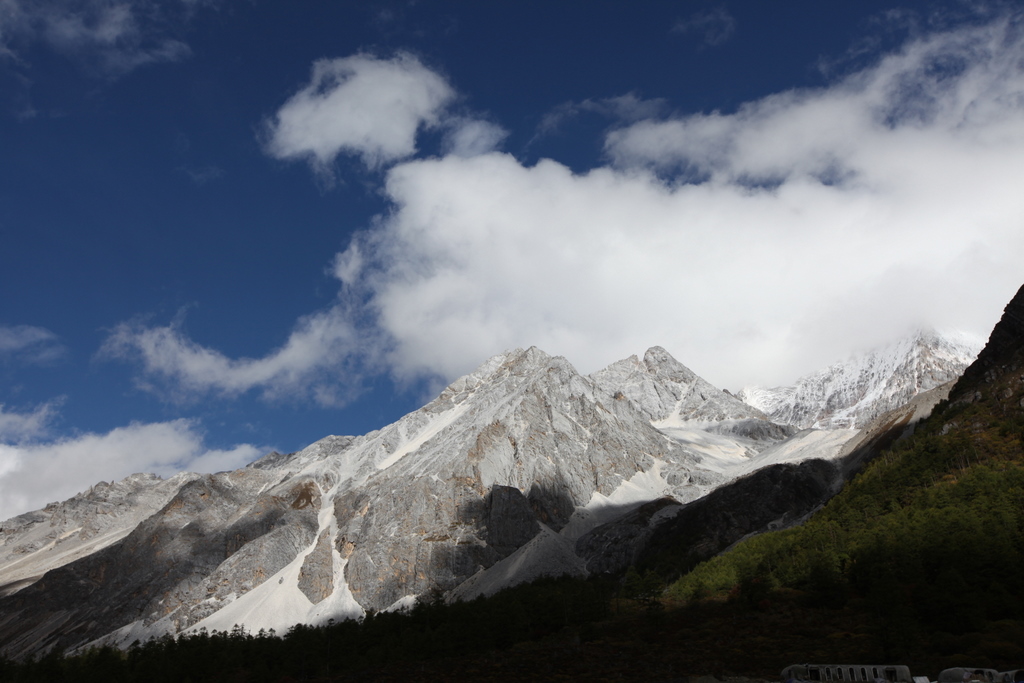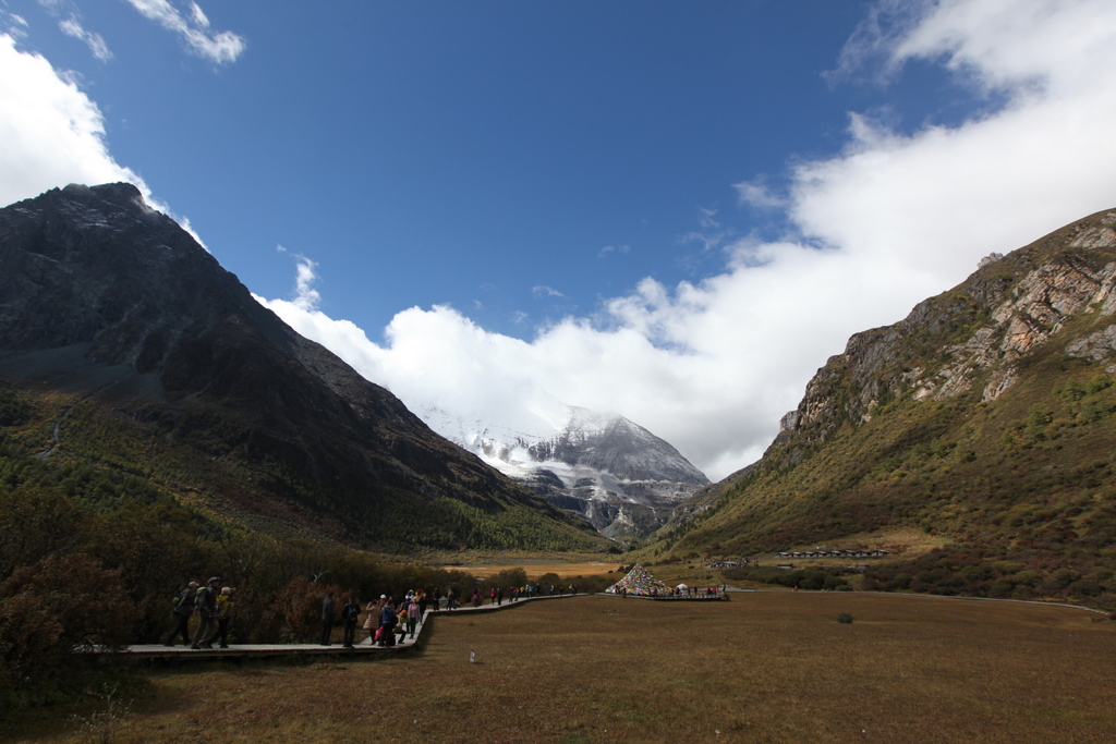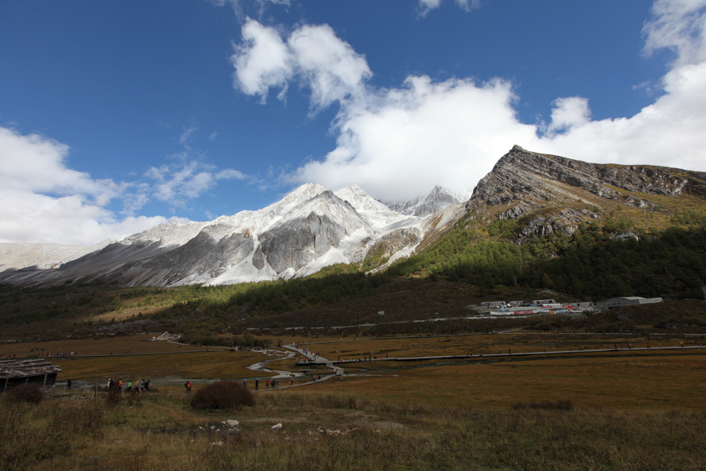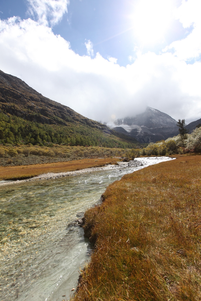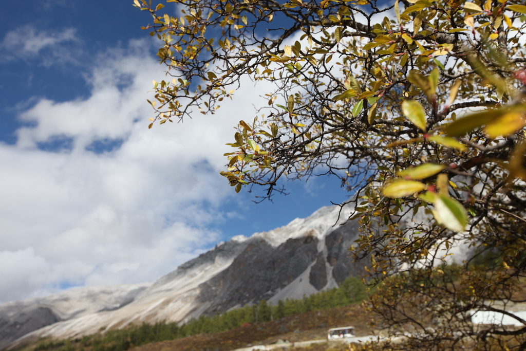 已是接近中午,我们还得继续,冲古寺到洛绒牛场5公里的步行栈道很是漂亮,但为了留点体力爬牛奶海的5公里,我们买了80块一个人的汽油车(注意,并没有传说中的电瓶车,这丫用的是摩托车的发动机,尾气浓烈)送我们到车能走到的最后一站。路上风景已经如画,雪山露出真容,蓝天已然出现,晴天钟精确到小时的预报本来预报是第二天晴天,现在能看到蓝天使我们非常感激。