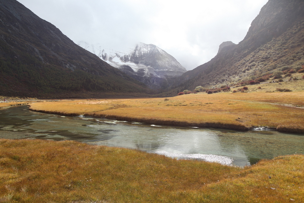 我俩悠闲的上路,当听到工作人员说来回走路需要5个小时的时候,我没有太大惊奇,还对旁边300来回的骑马的表示不解。我们边走边拍,碧蓝的河流、金黄的草甸时近时远,渐渐的,我感觉到一些吃力,渐渐的,爬个10米长1米高的小坡也像是跑了400米的感觉,一看指甲,全都紫了,LP还没事,拖着我继续。走着走着,天空突然瞬间阴云笼罩,竟然下起了冰雹!防风衣和背包防水罩在这时突然变得那么温馨,本以为下雨就根本没法玩了,现在带着帽子、罩好背包,简直和晴天一个样,恩,这一点LP还是有远见的。