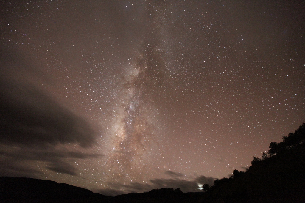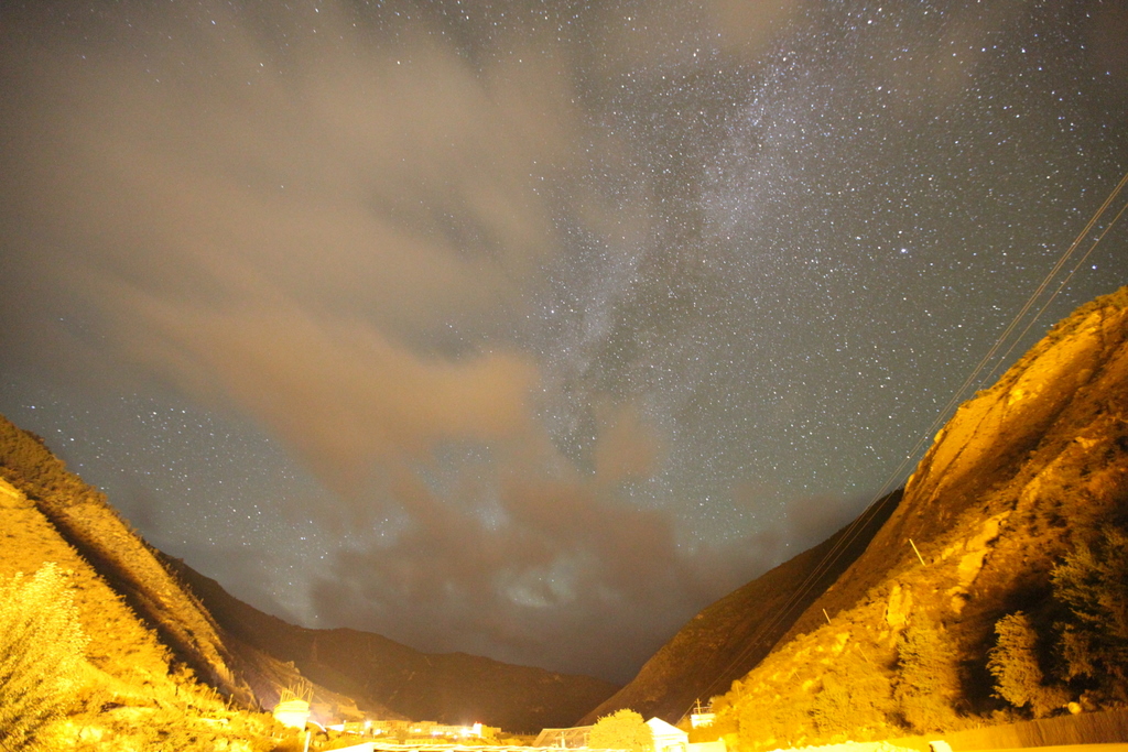搭完帐篷,dox叫已经累个半死的我去拍星空,拍星这事儿一般都是我主动,今天却快要退缩了,下楼云还挺多,不过竟然在慢慢散开,拍了几张看天空越来越好,我们决定开出去更暗的地方试试。到了上午的那个停车场,亚丁游客中心巨大的黄色灯光照的如白昼一般,前方的路上放着路障,我们以为和白天一样不让私家车进入,便停车拿上相机脚架试图往里走一段,到一个比较黑的旷野去拍,没走多远,天空就暗下来,漫天繁星出现在眼前,仔细一看,银河就悬在天际,终于感受到5DII高感的威力,即使不用赤道仪,ISO6400,16mm,30秒即不会脱线,又能把银河拍的灿烂无比,还记得高中时和风哥,酥胸去东川红土地,Nikon D70s在赤道仪上跟了10分钟,才有如此效果,感慨星野赤道仪的时代已经过去了。