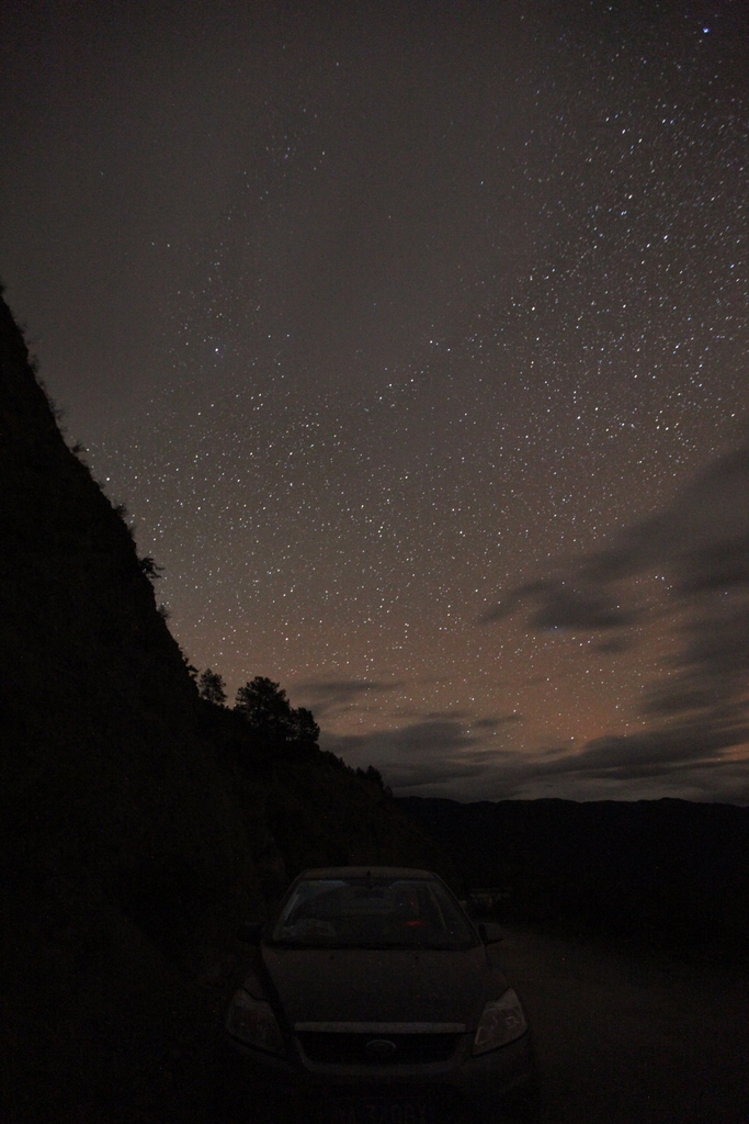 出乡城时,两条路出现在面前,一条220km直接去中甸,要翻越大小雪山,问了交警说路不好走;另一条185km去得荣绕行个等边三角形再去中甸。我们看时间不早,选择了又近又好走的绕行线路。山基本绕完了,路还算平直,开着开着就进入了黑夜。金星悬在西方低空,那么的明亮,天全黑下来后,我们发现竟是漫天繁星!找了一个宽阔的直路停下,关了一切灯光,银河渐渐的把我们照亮了!