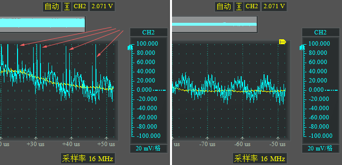 去掉Cin的版本测量该处出现了大量的尖峰,瞬间内心极其崩溃,突然想起之前看到过的寄生电感,难道这段只有1.3cm、还被我特意加粗过的导线上,由于噪声频率很高,【电感】已经到不能忽略的地步了呢?